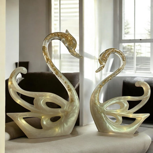 Couple de cygnes lumineux en résine époxy, feuilles d'Or 18 Carats.
