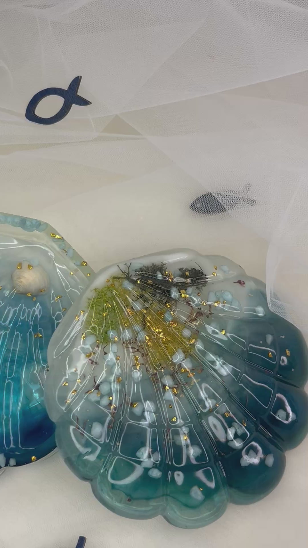 Color: Ocean Blue with blue and gold stones and seaweed, shells, thin branches of dried flowers.