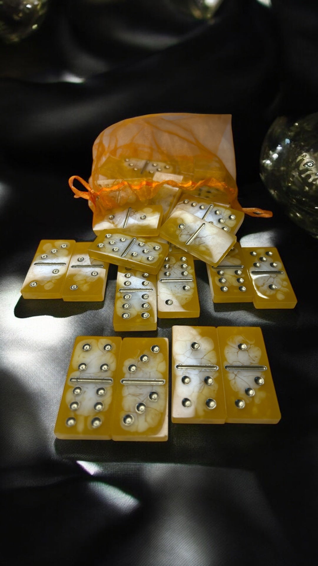 Découvrez un magnifique jeu de domino artisanal. Chaque pièce est minutieusement fabriquée à partir de résine époxy transparente de haute qualité.