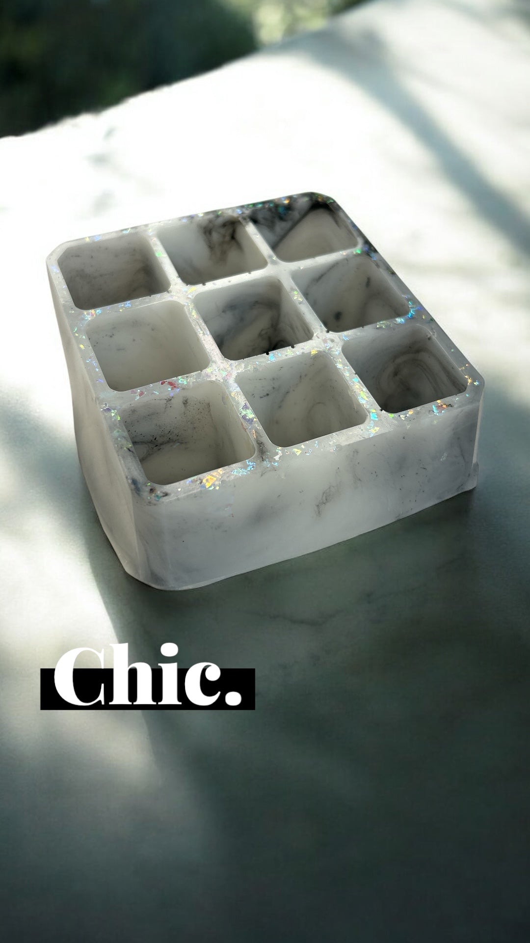 A super cute and unique 9-compartment makeup organizer. Perfect for brushes or lipstick.