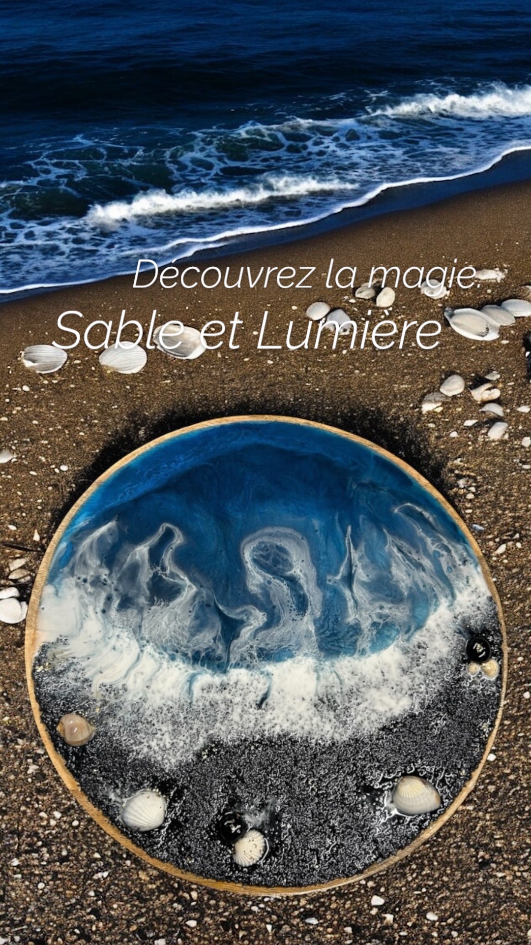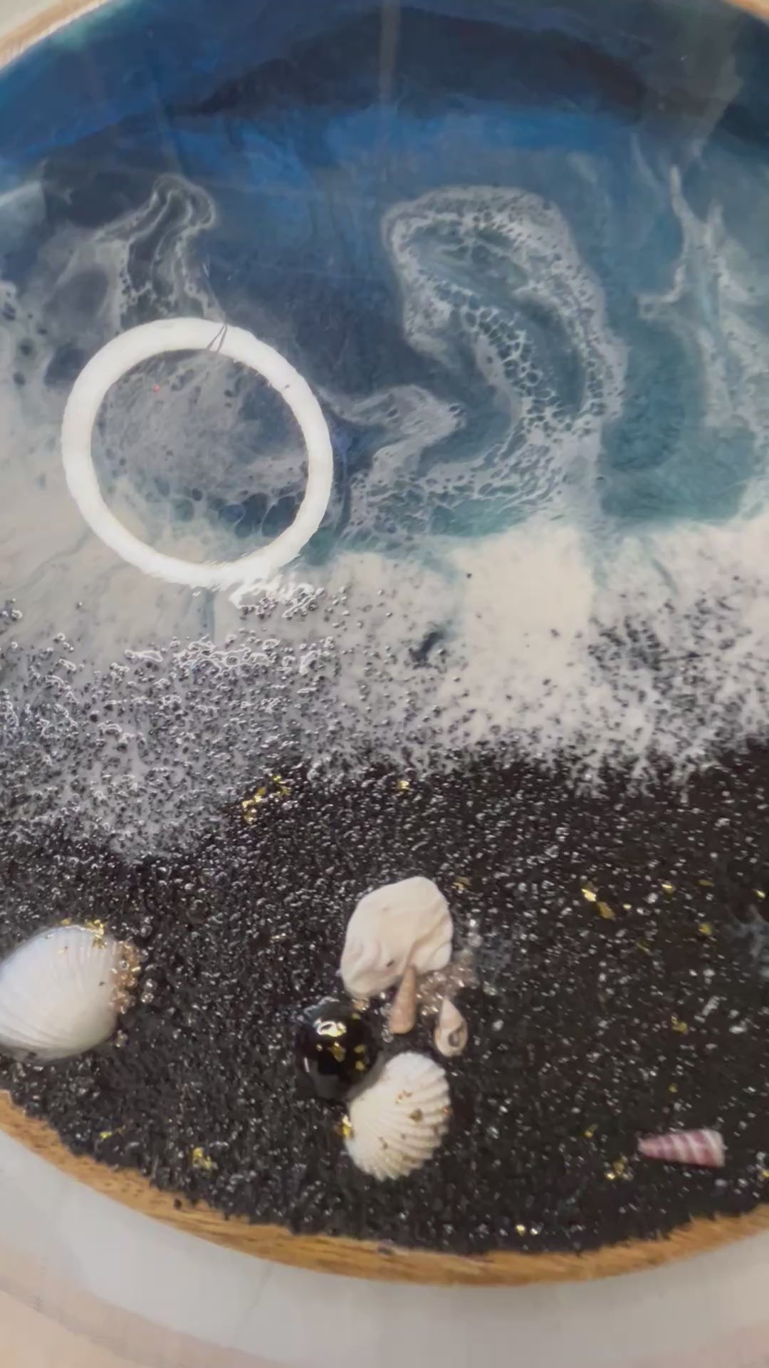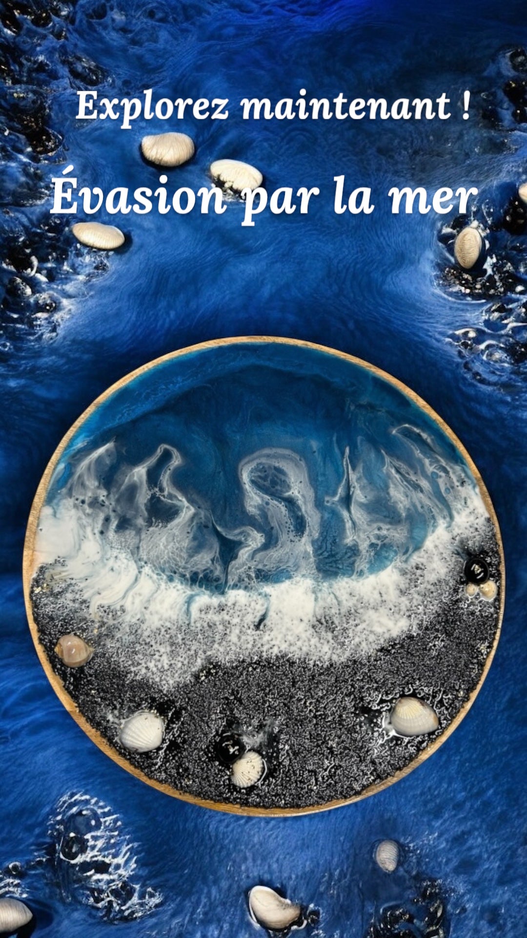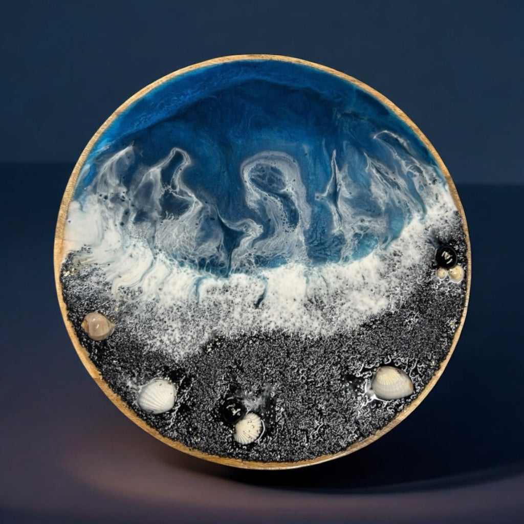 Technique : résine époxy, encres et pigments, incrustations naturelles (coquillages, perles, pierres)