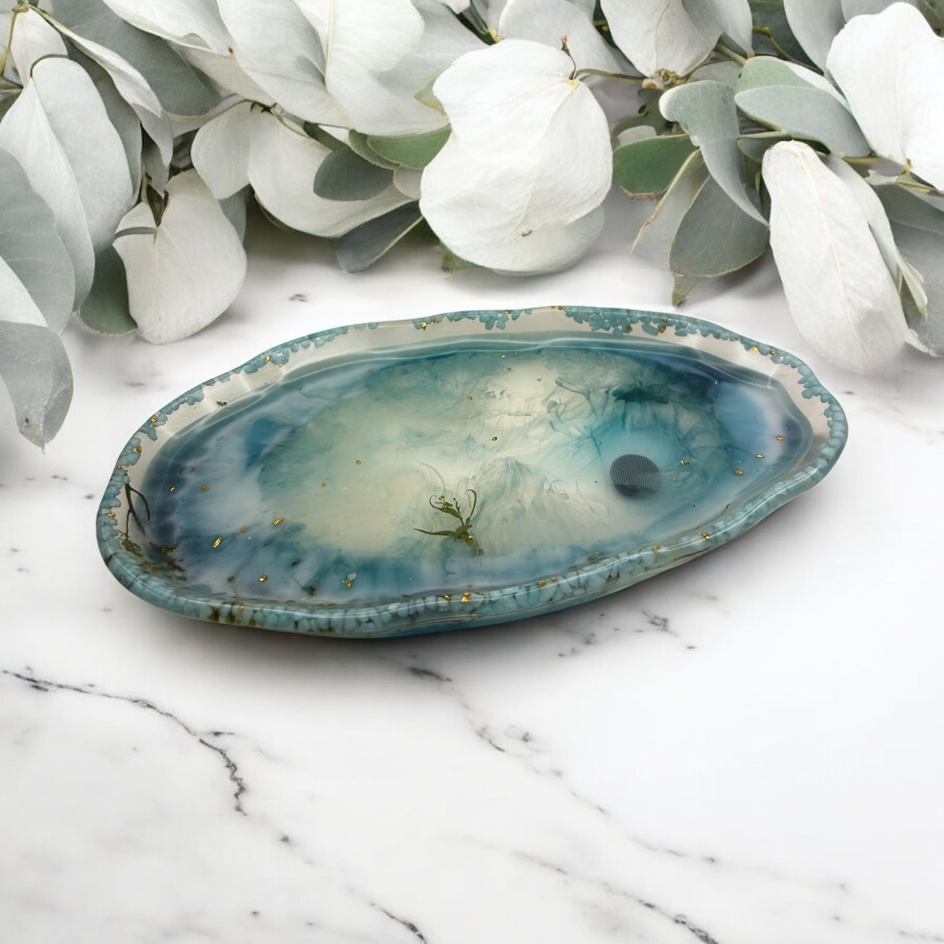 Couleur : Bleu avec une nuance de blanc avec des pierres bleu ciel et des plantes séchées et des pépites d'Or