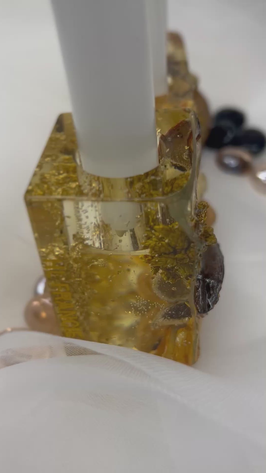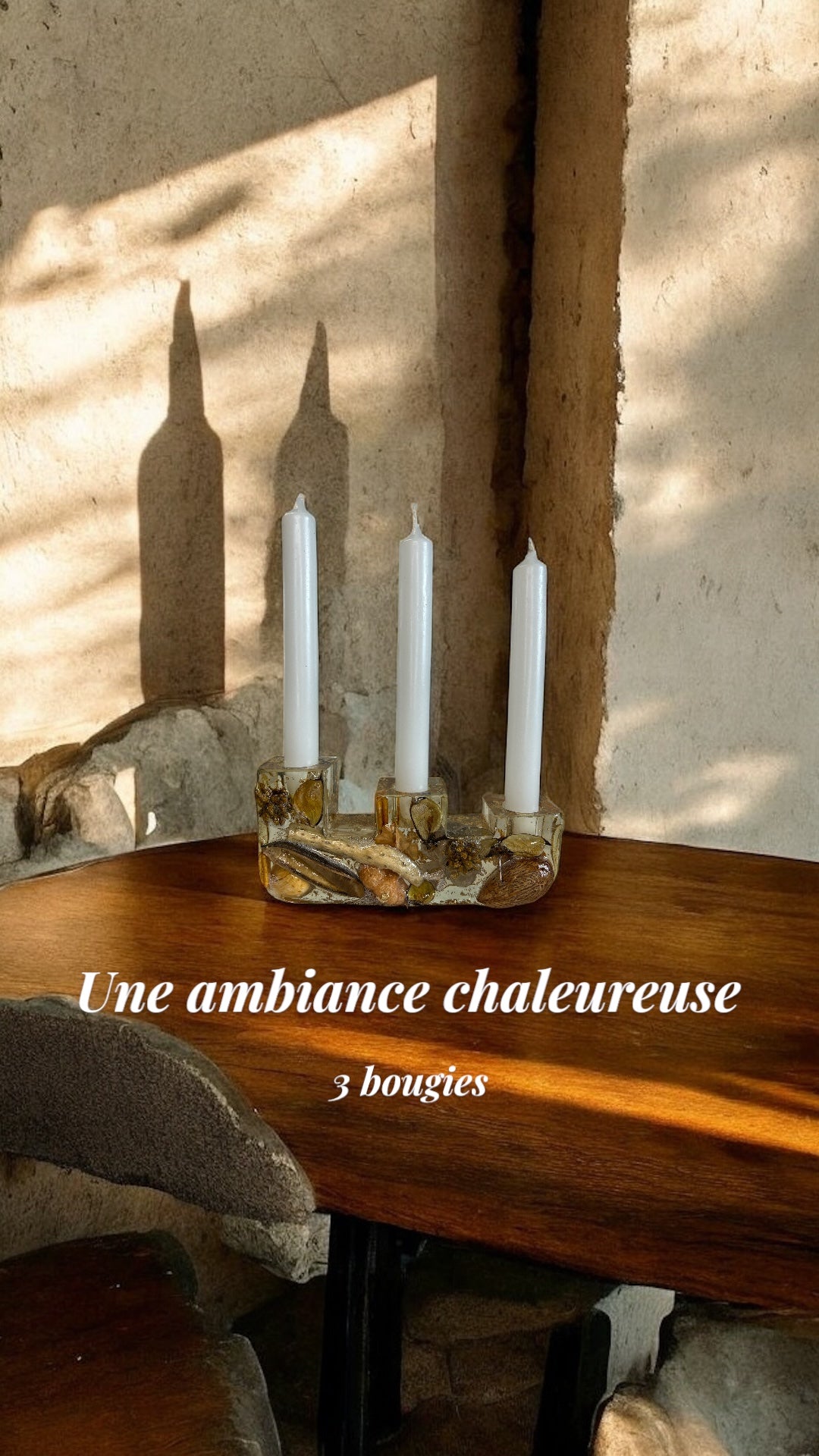 Bougeoirs en résine époxy avec des fleures séchées et des feuilles d'Or 18 Carats.