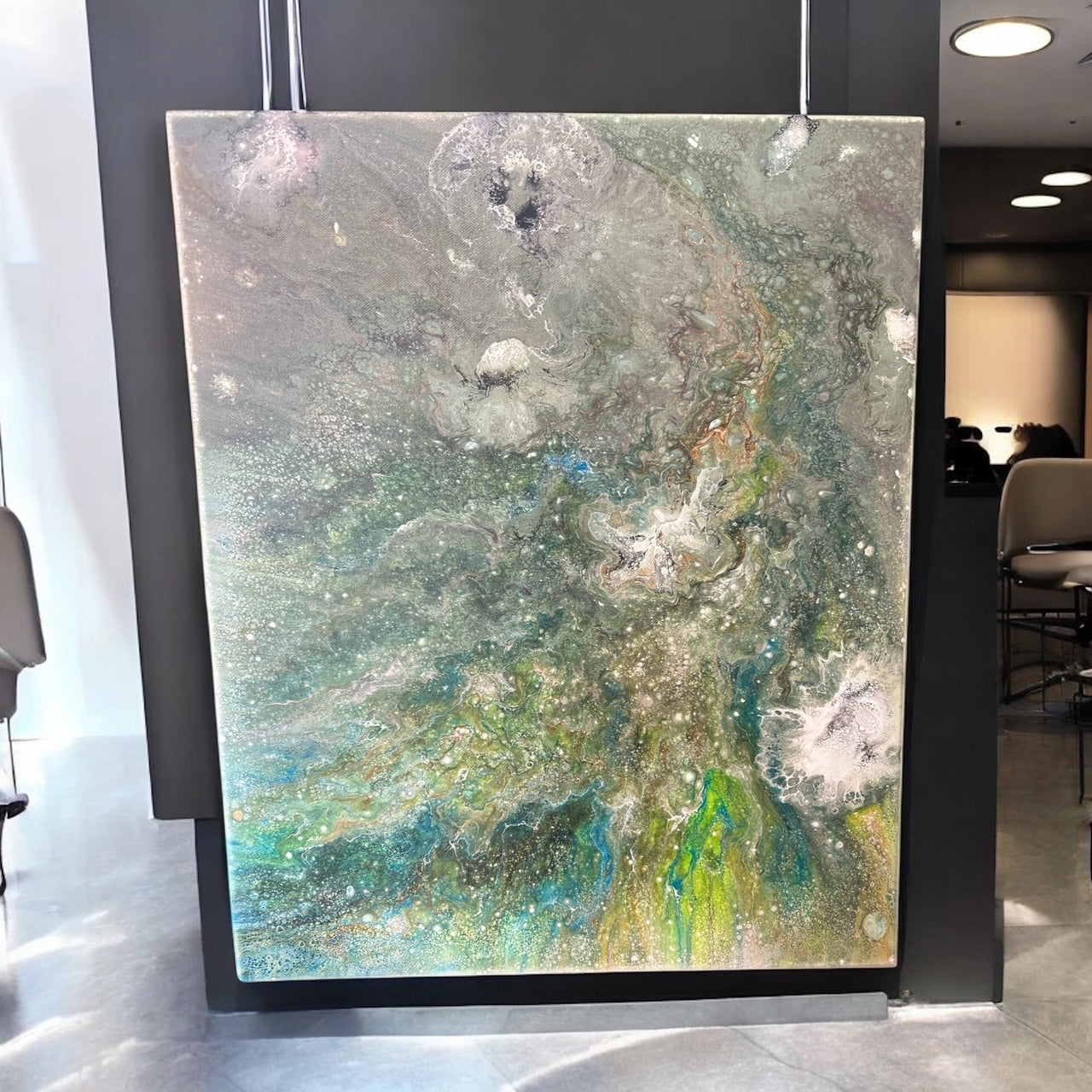 Cette œuvre abstraite évoque un univers céleste et onirique, comme une plongée dans les profondeurs du cosmos ou les méandres d’un rêve. Des teintes douces de vert, de turquoise, de gris et de blanc fusionnent en de subtiles vagues, créant une texture vaporeuse presque galactique. L’effet de cellules et de mouvements diffus donne l’impression d’un brouillard cosmique, parsemé d’étoiles et de nébuleuses.