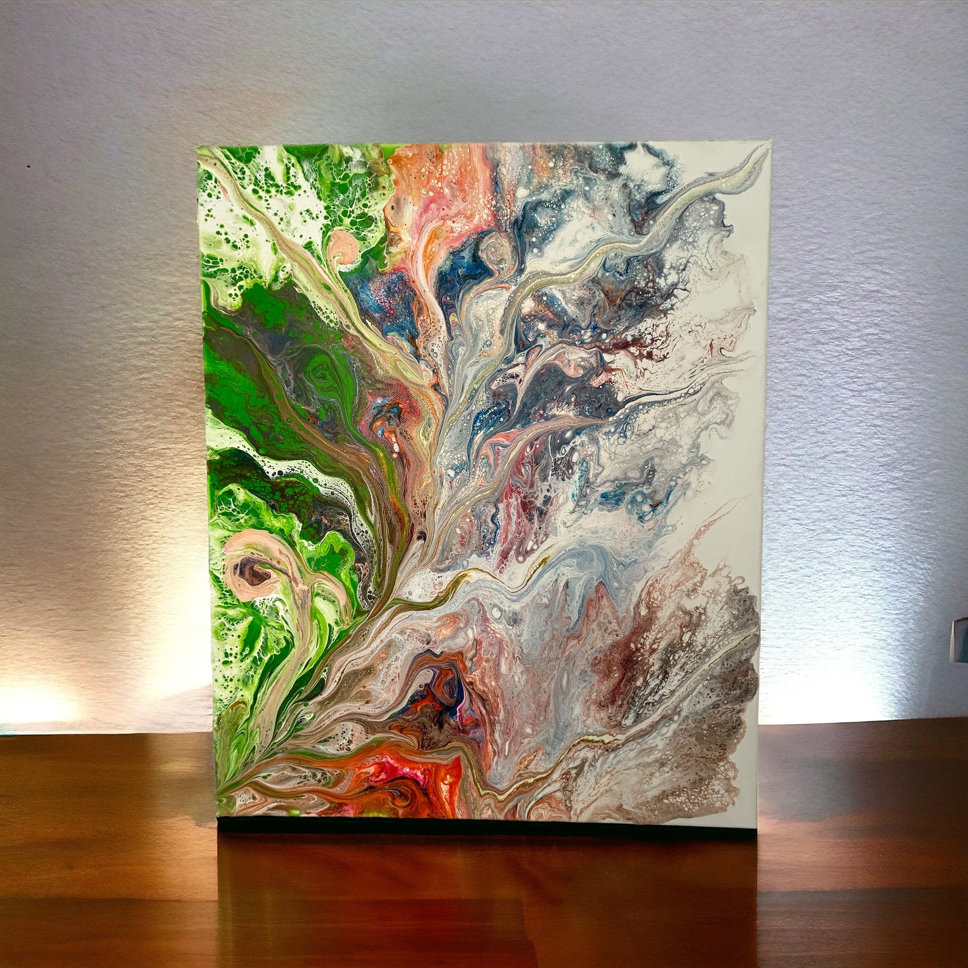 Cette toile acrylique révèle une explosion de couleurs vibrantes et organiques, évoquant la naissance d’une force naturelle en mouvement. À travers une technique de pouring maîtrisée, les pigments fusionner et se repousser dans un ballet fluide, créant des volutes dynamiques et des contrastes puissants.