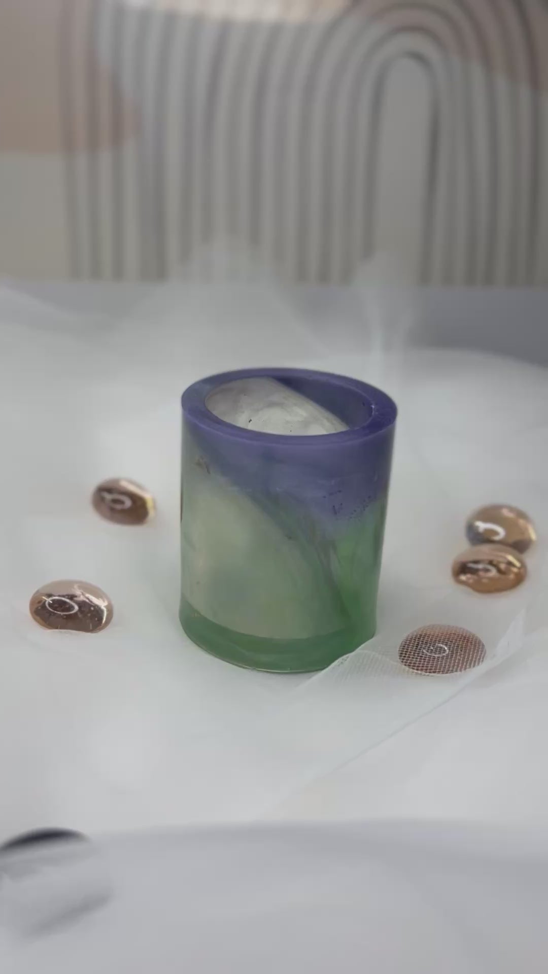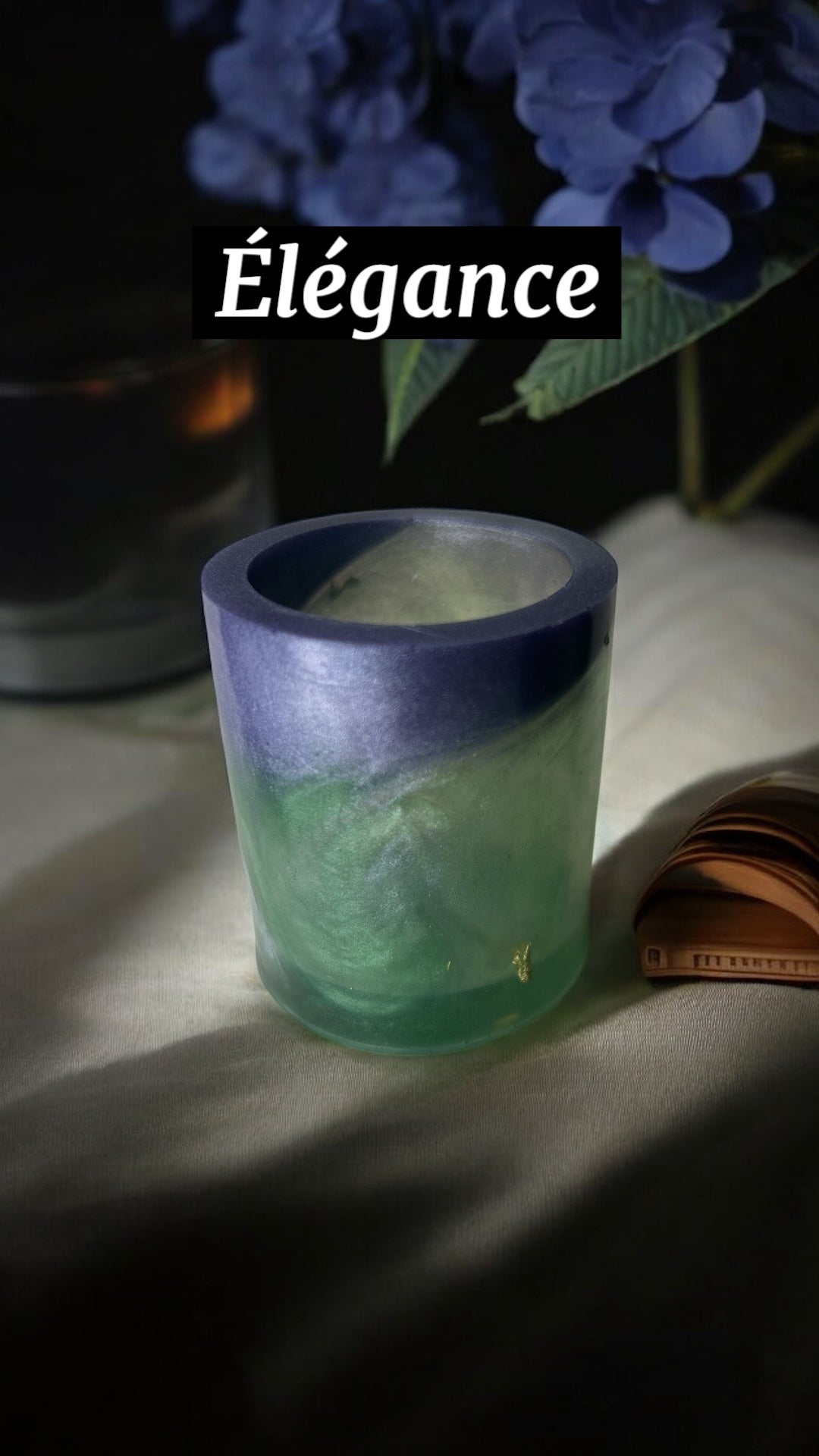 Pot à pinceaux de couleur vert et violet avec des fines feuilles d'Or 18 carats.